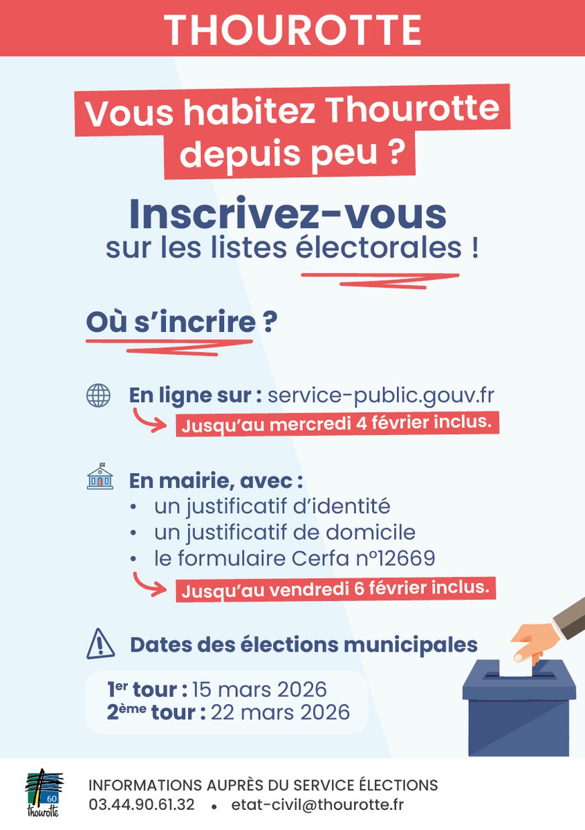 Informations en mairie, auprès du service Élections : 03 44 90 61 32 etat-civil@thourotte.fr